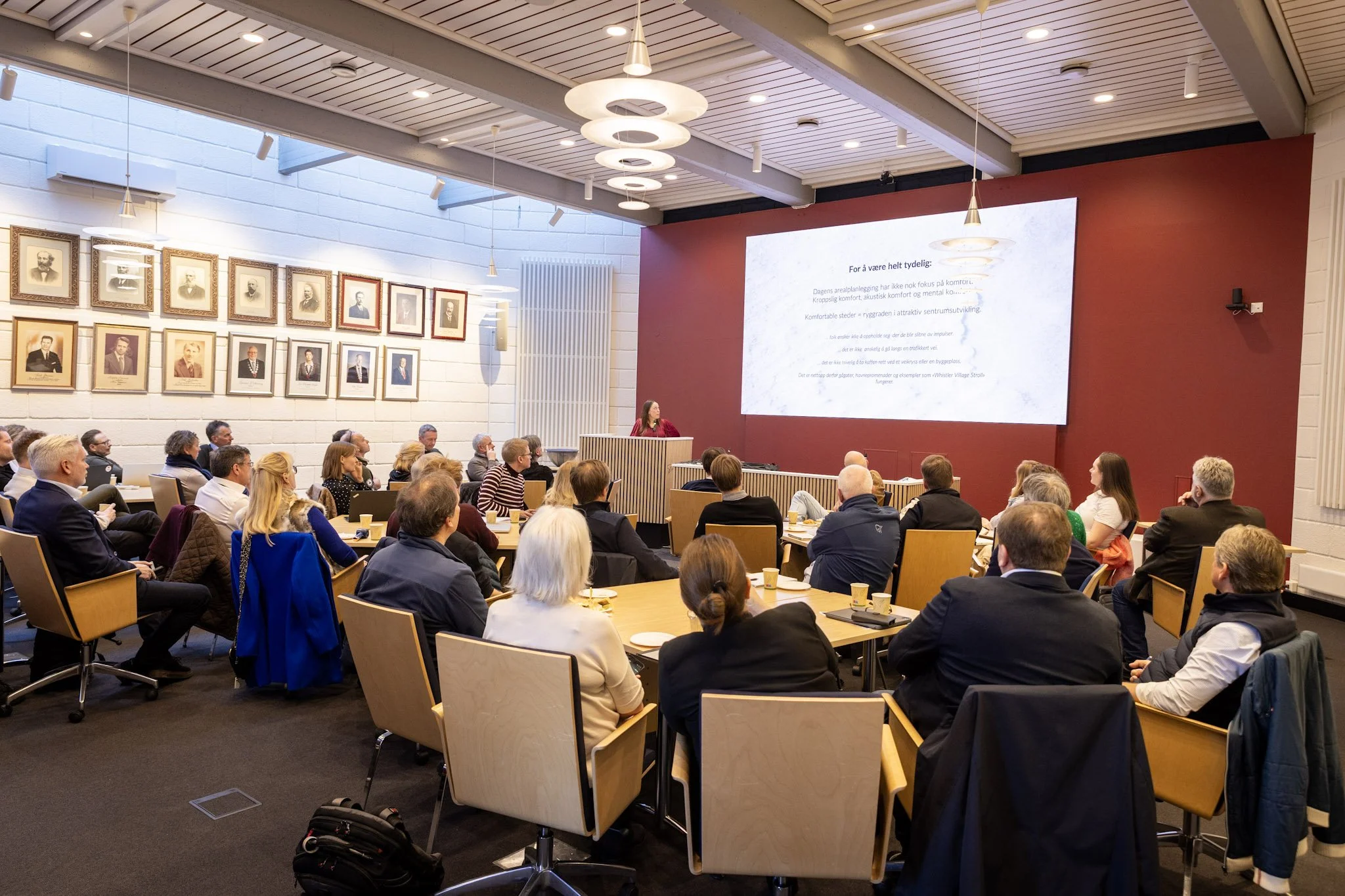 Gjennom eksempler fra blant annet Whistler i Canada viste hun hvordan små grep i utformingen av gater og byrom – som solforhold, vind, utsikt og gode møteplasser – kan gjøre steder mer komfortable og attraktive å oppholde seg i. Attraktive sentrumsmiljøer oppstår ikke av seg selv, men må planlegges helhetlig – også i rommene mellom bygningene.
